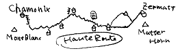 行程 1996年4月14日 シャモニ-グラモンテスキー場-アルジェンチェール小屋 15日 -トリエント小屋-シャンペックス-ベルビエールスキー場-モンフォート小屋 16日 -ディス湖経由ディス小屋 17日 -ピンダローラ-ヴィネット小屋 18日 -レヴェークのコル経由トレント小屋 19日 -ツエルマット メンバ 渡辺賢二、黒川春水、伊藤文博 シャモニガイド協会主催のシャモニ・ツエルマット6日間コースに参加。 ジャンとシルヴァンという名のガイド、お客は11人、フィンランド人二人、 オーストラリア人一人、イタリア人一人、あとは僕ら日本人三人とフランス人 。テレマークスキーは僕ら三人と、オーストラリア人のジョージ(数年前蔵王 坊平に居候していた)の四人。 北周りのフランスルートをとりましたが、天候にめぐまれたいへん愉しめまし た。二日目に二日分の行程をこなしたため、余裕ができ、5日目、6日目はヴ ィネット小屋からトレント小屋経由ツエルマットという大回りコースをとりま した。 うわさどおりのアルパインスキー向きのツアールートでしたが、テレマークス キーでもなんとかなりました。急斜面とアイシーなバーンが多い。トラブルは ありませんでした。ほかにも十人くらいのテレマーカーをみかけました。今回 のために取り付けたクトーが有効的でした。 ガイドつきなので、マイペースというわけにもいかず、早発、早着、休みなし の、シャモニガイド流のスピードツアーでした。パックも5キログラム!くら いとチョー軽モード。天気がいいのだから、途中で深雪をすべったり、して遊 べばいいのに、とも思いましたが、シャモニーガイドは頑固に昔からのやり方 を踏襲していました。スピード、イコール、セイフティということなのでしょ う。小屋には午後早くにつくことが多く、のんびりとした半日をすごしました 。 同じグループの客は中高年が多く、体力もありスキー技術もたいへんうまかっ たです。若いグループも多く、ガイドレスでツアーしているひとたちもたくさ んいました。天気がよければ、ま、大丈夫なのでしょう。 宿帳には数日まえに訪れたTAJメンバーの名前も二人ほどみられました。テ レマークでオートルートをツアーするのはいまやそんなに珍しくないようです 。日本人でも、僕が知っているかぎり、少なくとも一ダース以上はいるでしょ う。 十年前の竹内利春氏あたりがパイオニアのひとりといえるとおもいます。アゾ ロのエクストリームとカルフエクストリームの組み合わせだった、といいます 。僕らは皮靴がふたり、プラスチックがひとり。ジョージョはターミネータを はいていて歩きにくそうでした。 ハイシーズンのため、各小屋とも大入満員状態でした。次週にスキーマラソン があるとかで兵隊さんが多かった。急斜面をストックの股制動で直滑降するト レーニング中の選手にもあいました。雪がいくらかすくなかったのか、スキー を脱ぐことはありませんでしたが、ゴールデンウイークころだと歩くところが でてくるでしょう。 シャモニにもどり、モンブラン登山とスキー滑降を計画していましたが、さし もの好天がくずれあきらめました。