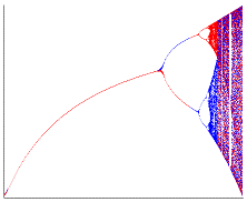 横軸にパラメータ値(λ)をとり縦軸に個体数の値(X)をあらわすグラフの上に、ロジステイック方程式の結果(各パラメータ値に対する個体数)を記入していくと、パラメータ値が低いときは少しづつ上昇していく一本の線を描き(周期1の軌道)、パラメータ値がある値を越えると線が二つに分かれます(周期2の軌道)。パラメータ値が増加するにつれ分岐は倍になり、また倍になるという過程(倍周期)を繰り返すのです。