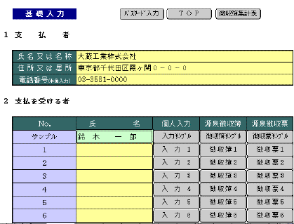 「EXCEL年末調整」は、<基礎入力>シート、<個人入力><徴収簿><徴収票>各11枚のシート(うち各1枚はサンプル)、<徴収簿集計表>シートで構成されています。