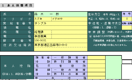 「本人扶養項目」、「控除金額計算」、「給与所得計算」の該当欄に該当事項を入力してください。年末調整の計算を行い、源泉徴収簿及び源泉徴収票を作成します。