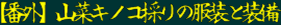 【装備】:必携は折り畳み式キノコ鎌だねっ(羨ましいぜ!)。あとは収穫物を入れるザックか籠。A本氏はキノコ籠も改造してあって、肩下げタイプの巾広ベルトにしてある。其処へ更に通常の腰紐も付いているので重量は肩に、腰紐でブラブラと籠が動いてしまうのを抑えている。かなり使いやすそう。