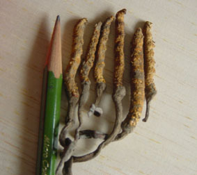 「鶏と一緒にスープにするといいですよ。葱少しと生姜も一寸、塩、酒、胡椒など入れますね。湯葉やどんこしいたけ、千帳(豆腐を圧縮して薄くしたもの)と一緒に煮てもいいです。」冬虫夏草は水洗いして湯葉で千帳や椎茸を巻き込んでたわら状にした中に差し込む。それをスープで煮込むのだそうだ。私は圧力鍋を使って作ったがとても柔らかくなって良かった。