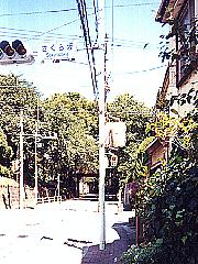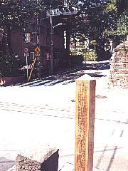 この踏切の道をそのまま歩いて約5分、桜坂を示す交差点と、木柱があります。