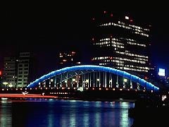 元禄6年(1693)に木橋がかけられ、当時、現在の両国橋を 「大橋」と呼んでいたので、こちらを「新大橋」としたそうです。その後、明治45年 に鉄橋として架けられたトラス橋は大正12年の関東大震災に耐えました、昭和51年に現在の斜張橋になりましたが、愛知県の明治村に以前の橋の一部が復元されています。 またこの橋はライットアップされ、グリーンとイエローのイルミネーションが美しく、ドラマ「ロング・バケーション」のロケ地として有名です。ライトアップは日没から22:00迄です。