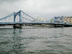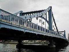 当時の深川区清澄町と日本橋中洲町を結ぶので清洲橋と命名されました。この橋ができるまでは 「中洲の渡し」があったそうです。大震災後の復興事業で、当時、世界でも美しい橋として知られていたライン川に架かるドイツの ケルンの大吊橋をお手本に昭和3年(1927)に完成しました。曲線的な優美さをもった女性的な橋とされています。ここも、さまざまなロケ地として使われています。夜になるとこの主塔にスポットライトがあたり、それを結ぶケーブル部分がピンク色に灯ります。