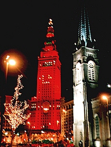タクシーで15分程走り、市内にあるSheraton Hotelに到着したのは20時過ぎであった。 「寒い!」雪こそ降ってないものの、震え上がる寒さである。気温は0度を割っていよう。 荷物を部屋に置き、夕食を食べに外出を試みる。着れるだけ重ね着したが、それでも寒い。 とくに風が冷たく、剥き出しの頭部がキリキリと痛い。両耳を押さえながらよろよろと歩いて いる姿は、ムンクの叫びそのものであった。ライトアップされた建物は見物であったが、ホテルのまわりにはレストランは全く見当たらず。 30分程歩いただけでホテルに戻り、夕食はルームサービスのサンドイッチで終えてしまった。 なんとも散々なCleveland初日である。 Clevelandの夜景