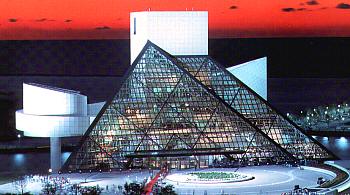 翌朝、まっすぐに向かったのがRock and Roll Hall of Fame(以降、Hall of Fame)である。 1994年に設立された、おそらく世界で唯一・最大規模のロック博物館であり、著名ミュージシ ャンの本物ステージ衣装を展示している場所だ。 私が経由地としてClevelandを選んだ理由は、実はこのHall of Fameを訪れるためであった。 なぜならここには我らZEPP信者の生神であるJimmy Page様のステージ衣装「ドラゴンスーツ」 が展示されているとの言い伝えがあり、いつかは参拝したいと心に秘めていたからであった。 しかし実際のところ、Rock and Roll Hall of Fameの全容はほとんど謎である。 まず「ホントに行ったことのある人」が全然まわりに居ない。日本人はおろか、アメリカ在住 のマニアにもいない。「そんなところがあるの?」といったリアクションが殆どである。 Hall of Fameのホームページも存在するが、展示物に関する記述はほとんどない。肖像権上の 問題で写真を全く載せられないらしく、また入場者の撮影も固く禁じているらしい。 「ホントにドラゴンスーツがあるんですかね?」渡米前に某巨匠女性ZEPPコレクターに確認し たところ、「え?あるある。それも白ドラゴンスーツ。間違いないわ」との確証に満ちたお言 葉を戴いた。巨匠が何を持ってそう断言されてるか不明だが、ここは信じるしかあるまい。建物はガラス張りのピラミッド型だった。正面入り口から入ると、すぐ左手にチケット売り場 があり、入場料は大人14ドル50セント。「カメラ、ビデオの撮影は固くお断りします」と いう看板がドーンと立っており、その気がモロにある私としては緊張感が高まる。 まずはエスカレータで地下に。ここが順路の最初で、徐々に上に上がって行く仕組みである。 映画館のような入り口があり、そこでチケットをちぎられ、腕に赤いベルトのようなものを着 けられる。拝観パスのようなもので、これを着けていれば当日中出入りは自由とのこと。 薄暗い場内を、目的のものを目指して歩き回る。 「ロックのルーツ」と称し、壁には様々な巨人達のパネルが飾られている。ヘッドフォーンで 何やら音楽が聴けるらしいが、こちとらそんなものには興味が無い。先にドンドン進む。 やがて、派手な衣装を着けたマネキンが立ち並ぶコーナーに出くわした。 ダイアナ・ロス、WHOのロジャー・ダルトリー、ロッド・スチュワート、デビット・ボウイ、 マイケル・ジャクソン....マネキンとネームプレートを食い入るように見て歩くが....。 Rock and Roll Hall of Fame 外観(絵葉書より)