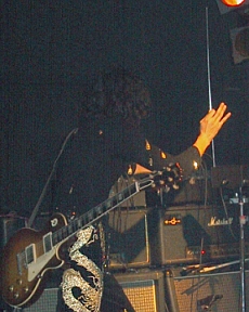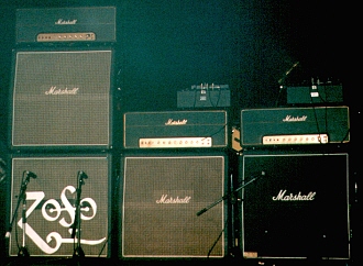 基本はMarshallのヘッド1+スピーカーキャビネット1の組合わせで、会場の 規模によってその数を増減させている。写真は10/23/98川崎クラブ・チッタ における最大構成のもの。ヘッドの上にEchoplexが2式置かれている。 |