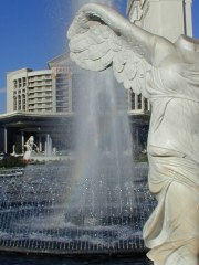 右の写真のような噴水の中に見える虹は小さく見えますが、