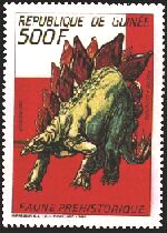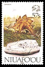 剣竜目のステゴサウルス(屋根を付けたトカゲの意味)は草食で全長約9m、体重10トンで、中生代ジュラ紀に多く棲息していました。アメリカやヨーロッパから骨格の化石が発見されています。ステゴサウルスは、背中の上の菱形をした板状の骨としっぽの上にある4本の棘が特徴です。100年ほど前に骨格の復元が行われたときは、板は背中の上に一列に並び、しっぽの棘は4対並んでいました。その後、板は左右交互に並び、しっぽの棘は2対であったと考えられるようになりました。これらの骨は背骨とどのように関節していたかがよく判りません。機能としては防御優先か体温調節が優先か、両方なのかは未解決です。