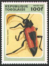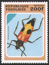 Insect Stamp of Republic of TogoA European began to invade Togo of a small country facing Gulf of Guinea in the 18th century, and it was occupied in 1885 by Germany, and it was it with protectorate Togo land, and eastern part was governed by the British and western part was geverned by the French after German defeat of World War I. The British territory western part became independent as a Ghanaian part in 1957, and the French territory eastern part became independent as Togo in 1960, and an area independent as a Ghanaian part joined it, too. However, it underwent independent afterward political confusion and shifted to military administration in 1967. It shift to republican form of government (a civil administration) in 1979 and is succeeding in stabilization.