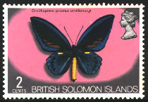メガネトリバネアゲハとゴクラクトリバネアゲハがインドシナからオーストラリアにかけて生息するトリバネアゲハの代表的な種類です。トリバネアゲハの雌は雄のように羽に緑色の輝きはありません。ビクトリアトリバネアゲハの雌を描いた切手が1965年に英領ソロモン諸島から発行され、雄を描いた切手も1980年に独立したソロモン諸島から発行されました。同じビクトリアトリバネアゲハの雄と雌の違いを比べてみて下さい。