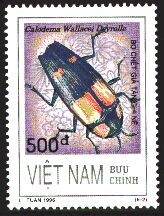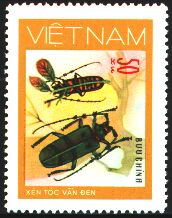 After that, south and North Vietnam were unified and Vietnam is borned. From this unified Vietnam, eight kinds of beetle stamps which drew longhorn beetle were issued in the same 1977. Eight kinds of stamps which drew Shield-backed Bug were issued further in 1982. Eight kinds of all are the beautiful new stamps unified by Shield-backed Bug. Eight kinds of insect stamps were issued also in 1986. After that, the beetle stamp was issued six kinds in 1994, and four kinds in 1996 respectively.