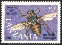 ツェツェバエは、眠り病の病原体であるトリパノゾーマを媒体させ、アフリカ大陸の北緯15度から南緯20度の範囲のうち約1,500km2の範囲にのみ分布します。そのため、この緯度の範囲はツェツェベルト地帯と呼ばれています。口吻は硬化して針状となり、吸血に適した形状となっています。このツェツェバエを描いた切手がアフリカ各国から発行されています。