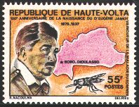 ジャモ・バンクエール(1879-1937)は、眠り病の研究家で、切手にはその病原体であるトリパノゾーマを媒体させるツェツェバエ(Glossina palpalis)が描かれています。