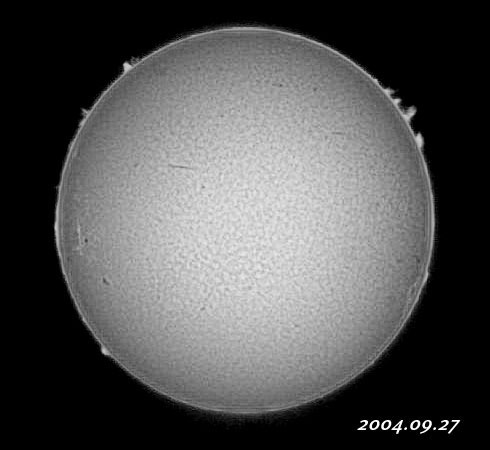 2004年9月27日の太陽Coronado P.S.T. + CCD(WAT-100N)表面は穏やかです、黒点も見えなくなりました。プロミネンスは、結構上がってますね。