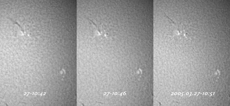 2005年3月27日の太陽望遠鏡:Coronado P.S.T.カメラ:CCD(WAT-100N)黒点群の周囲の活動が活発で、ダークフィラメントが数分間で変化していました。
