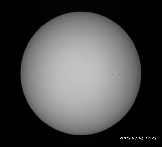 2005年4月5日の太陽-黒点望遠鏡:Coronado P.S.T.カメラ:CCD(WAT-100N)749黒点群、748黒点群、747黒点群、3カ所の黒点群がみえています。