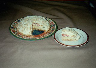 - オーブンシートの上で焼いた、残りのパイ生地をあらく砕き、6.の上に乗せ、茶こしきで粉砂糖をふるいながらかける。