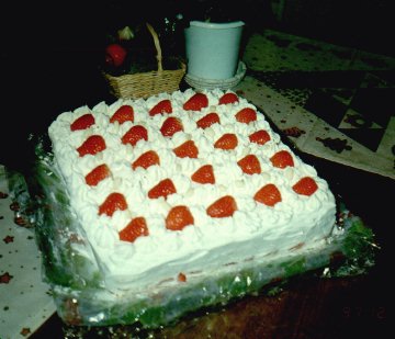 レシピ11の18cm丸型用の材料×3倍で、角型天板で3回焼きます。ところどころにホワイトチョコと食べられる金箔をまぶしました。いちごは3パック。生クリームは200cc3箱分。作り方はレシピ11と同じ。量が多くなるだけです。