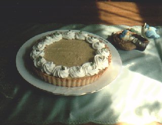 - 1.の台の周囲に2.のクリームを絞り出す。ビスケットにはかからないように、花のように絞りだし、うすく切ったピスタチオを飾る。