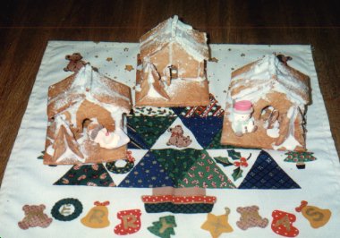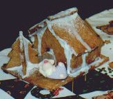 (11)くっついたら、反対側の側面と家の後ろも同様につける。それから両屋根、最後に屋根の上の棒をつける。どの部品にもアイシングをつける。