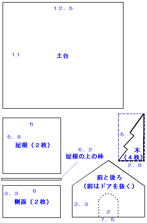 - (土台11cm×12.5cm、 高さ6cmの家、3個分)
