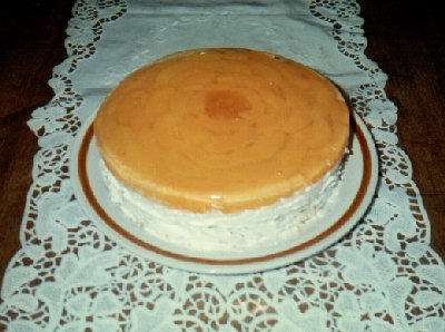 - (6)(5)の上の中心にアプリコットジャムをのせ、そのまわりに花びらのように中心から並べる。残った黄桃はスポンジ台の間にはさむのでとっておく。