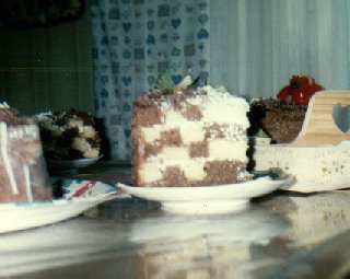- (3)外側に普通のスポンジがくるようにココア入りスポンジと交互にはめる。もう一つは、外側にココア入りのスポンジがくるように普通のスポンジと交互にはめる。
