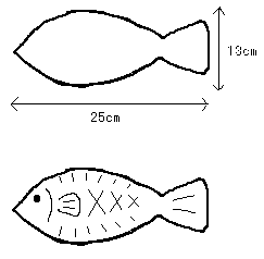 魚のえらに切り込みを入れ、空気穴にします。生地が残れば、ひれを作ると魚らしくなります。うろこや尾には包丁で浅く切り込みをいれたりしてください。大きさは、左手側に頭をおいて、縦13cm、横25cm位。