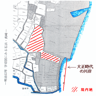 石浜城址について調べる為に荒川区の郷土資料館で過去の調査資料を探したところ、石浜城址についての 研究レポートを纏めた小冊子があって、その中に左下のような図が掲載されていました。これは明治12年 の字切図との事ですが、全ての区割りに何町歩とかの面積が記載されているので、今でいうところの地積図 ではないかと思います。このレポートの著者は左側の水路が折れ曲がっている事に注目して、これを石浜城 の外堀遺構ではないかと推論しているのですが、私はむしろ、図の灰色部分が石浜城の痕跡を示すものでは ないかと考えました。 この図の白地で区割りされている土地は水田で、灰色の部分は屋敷地、斜線部分は畑地とのことで、屋敷 地は水田よりも一段高くなっているものですし、畑も水が引けない土地ですから微高地になっていたと考え られます。つまり灰色や斜線で表されている微高地が、東側の隅田川と、白地で区割りされている水田地帯 に囲まれて、島のように浮かんでいる地形が読み取れるのです。 それでは、この城跡の地が現在のどの場所に当たるのか、いきなり今の地図と照らし合わせても、市街化 され区画整理の進んだ地図を見たのでは雲をつかむような話です。しかし区画整理される以前の大正時代の 地図となら、右下の地図のように古い道も残されているので何とか照合出来そうです。 | |