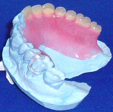 従来のレジン床(プラスチック)に比較して非常に軽く、コシのある素材を使用して義歯を作成します。またクラスプも同じ素材を使用するので金属を全く使いません。非常に軽いので上顎の全部床義歯にもっとも適しています。部分床義歯としても審美性にすぐれ、アタッチメントを使用しないので支台歯を加工しないで見えないクラスプをかける事ができます。 |