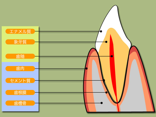 歯の構造です。歯の構造を知ることはむし歯予防、歯周病予防に有効です。