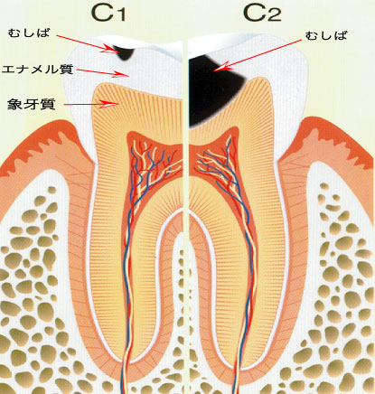 初期虫歯と象牙質まで進行した虫歯の対比図です。C1ではまだ痛みが無く、C2ではたまに冷たいものがしみる程度の症状があります。