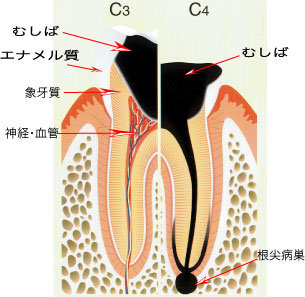 神経まで到達したムシバ(C3)と歯質の壁を破壊したり根尖病巣を引き起こすムシバ(C4)の比較図