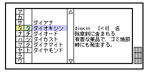 そんなとき、このカナ入力電子辞書「デクショナリ〜」をお使いください。普通の国語辞典と同じ要領で、大型液晶画面に表示されたタグを専用ペンでたどっていくと、候補の単語がカタカナで表示されます。