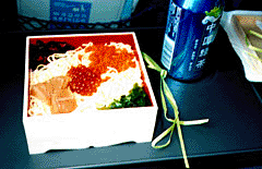 JR北海道の特急『スーパー宗谷1号』車内で買い求めた弁当。この蝦夷ちらしに限ったことではなく、北海道で食べる弁当はなぜかどれもうまい。魚介類が新鮮だからなのか?景色がよいからか?北のロマンの影響か?隣にある中国緑茶は青森駅で購入したもの。特にこれといった特徴がある訳ではなく、日本全国どこでも求められる品である。