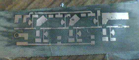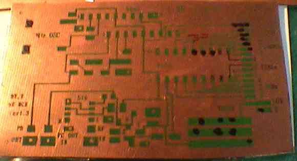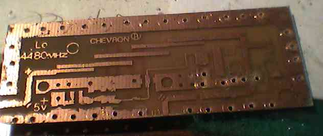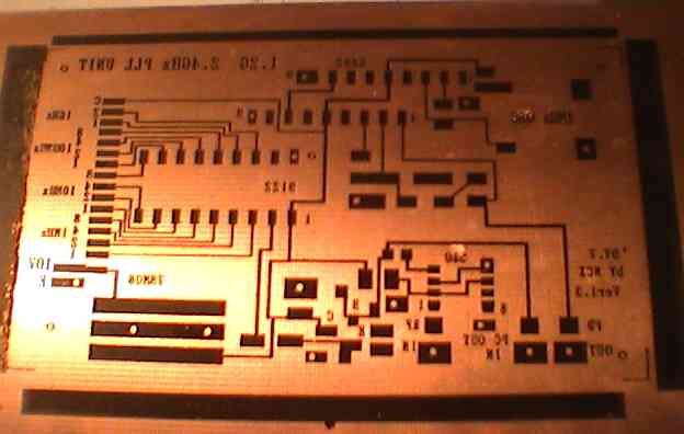で、帰ってからトナーで基板 をまたまたしつこく試した。今度は冊子のコピーを工夫してとり、ストリップラインではなく、細いパターンのものをスキャンした。それで、どうも端がかけるので、基板の外側に太くて塗りつぶした部分を作ってやった。
