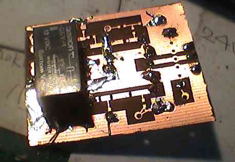 もうちょっとかなぁ・・・が、部品をつけだして気がついた。ありゃあ!!こりゃあ、リレーの向きが一つ反対だぁ・・!!!!仕方なく、一つを裏側、一つをパターン面につけた。お粗末様。これで動くかな、発振しそう・・・。パターンだけは直しておくかなぁ。