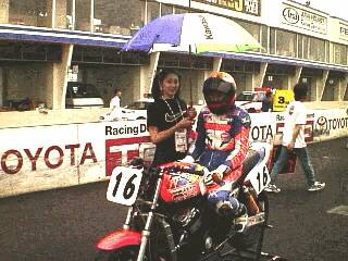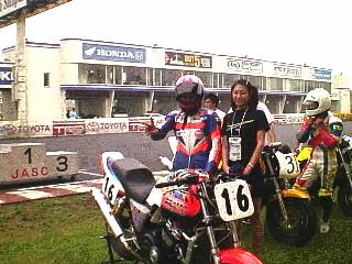 予選は曇り空の中で、2列目4番手で終了しました。 「天気が保てば良いな!」と思いながら、決勝を前に、FブレーキのOHを行う。 決勝は、やはり曇り空の中でスタートしました。 が・・・第一コーナーで多重クラッシュ発生! 中村選手は巻き込まれはしなかったが、赤旗中断。 オイル処理と救急車で、スタートからやり直しが決定しました。 ピットで待機していると、雨が降り始めました。 「再開まで10分程度の時間がかかります」とオフシャルから放送される。 回りのほとんどが、コースを見て、レイン・タイヤに交換を始める。 ホイールを外してタイヤ・センターへピット・クルー達が走って行く。 WiithMeの中村選手は、動揺ひとつせずに待ちかまえる。 (スペア・ホイールは無し。レイン・タイヤ代も無し。) 再スタートの時には、雨は小降りになってきていた。 スタート前のウォーム・アップ後にスターティング・グリッドに付いた時、 回りのほとんどがレインを履いていた。 しかし、ポールポジションはSPタイヤのまま。中村選手と同じである。 スタートの時には、天気が急転して太陽が顔を出し始めた。 ギャンブル成功! レースは、SPタイヤのままで再スタートしたマシンが、当然リードして行く。 予選タイムより速いタイムで周回を重ねる中村選手。 2番手までは追い上げたが、トップに4秒差まで詰めた処でチェッカー。 1位は、ポール to フィニッシュ だった。 表彰台に上った3台の全てがSPタイヤを選択したチームが独占した。 初の表彰台に緊張気味の中村みっか選手でした。 次回は、表彰台の真ん中でシャンペン・シャワーをして貰いたいですね! |
