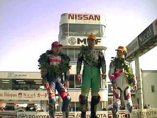 T.O.F これが今年最後のレースとなる。 N−NKクラスで筑波サーキットを走り、今シーズンは表彰台にも上った。 「そろそろ、表彰台の一番上を狙えるだろう!」と誰もが中村選手の事を思っていた。 天気予報を覆し、冬晴れの筑波サーキットで再び走る。 マシンも体調も万全だ。今回はチーム員の森澤選手から、初めてタイヤウォーマーを借りた。 路面温度が低い朝の予選では、タイヤを暖めてからタイムアタックしていては良いグリッドが獲得できない。 周回数も少ないので、出来るだけ前からスタートしたい。 そんな中村選手に、みんなが協力してくれる。 「彼に勝たせたい!」と、そんな気持ちが伝わってくる。 そして、予選が終了した。 中村選手は見事に予選で第3位を獲得した(4サイクルではトップ)。 決勝では、如何にして前の2台(2サイクル)を攻略するかを彼なりに考えていた。 しかし、プレッシャーは無かった。レースを楽しんでいるのだ。 スタート前の選手紹介の時にも、彼女とリラックスしていた。とても、余裕がある奴だ。 「ちょっとは緊張せんかい!」と思うほどだ。 スターテング・グリッドでヘルメットのシールドを降ろした時、中村選手はレーサーに変わった。 鋭い眼光で、第1コーナーを観ていた。 スタートのシグナルと共に中村選手は飛び出していった。 そして見事にホールショットを決めてくれた。 しかし、2サイクル勢は容赦なく中村選手との距離を縮めて来る。 中村選手には焦りは無いが、マシンの差が現れ始めている。 1周目には、既に抜かれてしまい、予選通りのオーダーで周回数を重ねて行く。 しばらくすると、第1コーナーでトップを走っていたポールポジションのNSRが転倒した。 後続車を早いうちに引き離そうとしてアクセルワークをミスったのだろう。 少し引き離されていたので中村選手は転倒には巻き込まれなかった。 これで、第2位に浮上した。 中村選手は、これ以降は終始マイペースで走り続けた。 これで今年2回目の第2位を獲得し見事表彰台に上った。 ゴールした中村選手は彼女と喜びを分かち合っていた。 今シーズン、転倒もなく自己ベストも更新できた。 来シーズンこそは、表彰台の真ん中を狙ってくれよ! |
