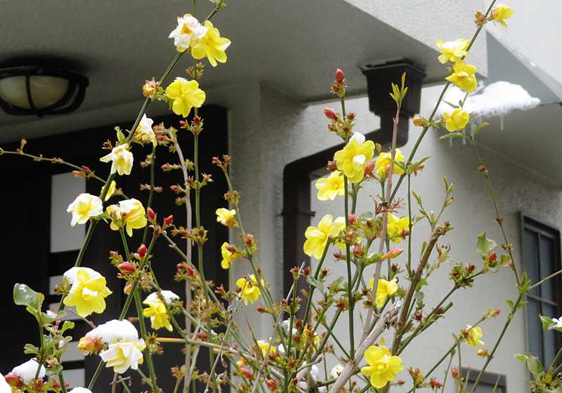 今日の画像は、黄梅(おうばい)です。町内にあるお宅の玄関脇にまだ小木ですが黄梅が咲いています。梅の文字が付いていますが、バラ科の梅ではありません。梅が咲く時期に梅に似たような花びらなので、この名前になったのでしょう。