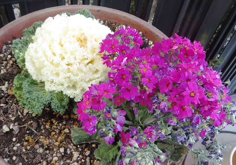 今日の画像は、我が家の鉢植えです。正月用に妻が鉢に植えた葉牡丹とピンクの花、まだ元気に咲いています。