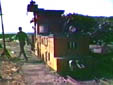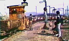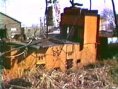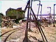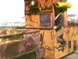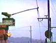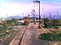 つぎに 海岸近くの空き地に廃車体がごろごろ転がってるとゆうので車で移動して見に行きました (⌒〇⌒)/ な、な、なんか めちゃくちゃすごいとこだなあ(^^;)えらく レトロなクレーン車と瓦礫の山、荒涼とした広大な空き地、左の写真の奥の堤防の向こうはすぐ有明海です(⌒〇⌒)/ てっきり 廃車になってると思って見てたら現場のおじさんが来て 動かしてくれるとのこと(⌒〇⌒)/油をさして ポールを架線に引っ掛けて・・・・(⌒〇⌒)/