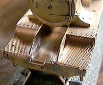 ![]() フロントデッキのフレームを取り付け!細かい部品付けはこれから(^^;) 編み目板はフレームを境に分割してあります。 |