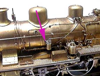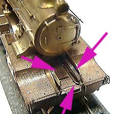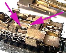 コンプレッサーのエアフィルタの固定ステー(矢印)を0.2板より自作。 逆転テコと排気管、エアの吸気管が複雑にからみ なかなか立体的な部分となりましたヽ(⌒〇⌒)ノ