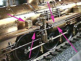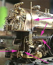 仮付けだった給水ポンプを固定。ランボード横のポンプ排気管と給水管取り付け。給水ポンプ用給油ポンプ取り付け。その作動ロッド(矢印)も自作(^^;)