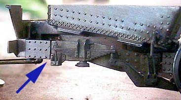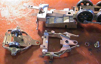 D51はボイラーと台枠の間が開いているので良く見えます(^^;)懸案であった従台車の二重首振り機構に着手(^^;)まず一体であった台枠と従台車本体を切り離し台枠側にも回転支点を取付けました。
