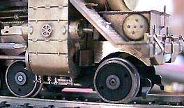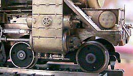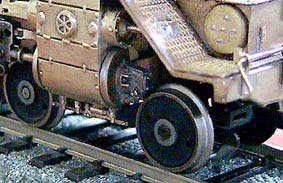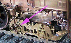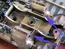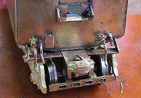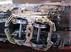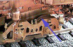 2003年10月13日今回は連休を使って懸案であった先台車と従台車のカーブでの当たり対策を進めました(^^;) まず従台車です(>0<)/ 一旦取り付け完了した従台車でしたが当め次郎鉄道のテスト線路であるカトーの730Rの線路に機関車を乗せて転がしてみると台車の後ろの車輪と主台枠が接触、また泥ダメの配管と台車の枠が接触して脱線、車輪の抵抗増大等でまともに転がりません(^^;)ありゃ〜〜〜