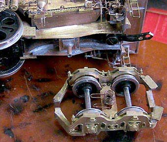 でよく観察してみると中心ピンが台車の先端についてる取付方法だと従台車全体の動きがかなり規制されて、うまく線路形状に従輪が追従していけないのが判りました。しばらく考えてしまいましたがふと考えると 当鉄道のC6249も同じ軸配置なのですが近年の運転会ではほとんど脱線したことがありません(^^;)即そのC62の取り付け方法を流用することにしましたヽ(⌒〇⌒)ノ